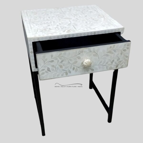 The floral bone inlay pattern on the front drawer is delicately set against a crisp white background, radiating subtle sophistication. The handcrafted bone knob adds to its charm, making it not just a piece of furniture but a piece of art. Supported by a sturdy MS powder-coated black metal base, it offers strong support and a striking contrast that elevates the overall look.