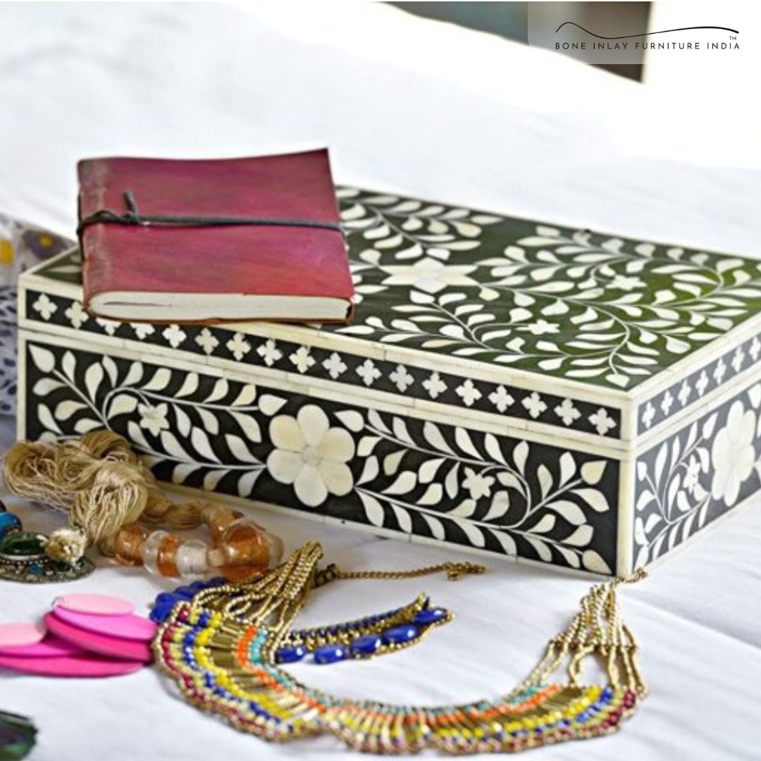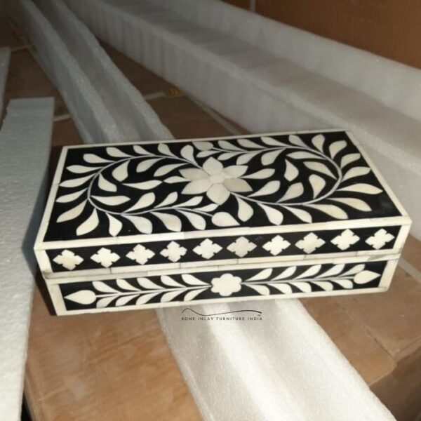 Discover the charm of tradition and elegance with our Geometric Floral Bone Inlay Box, a refined storage solution handcrafted to perfection. Designed using centuries-old bone inlay techniques, this exquisite piece features a stunning combination of geometric and floral patterns, delicately set in a blend of resin and ethically sourced camel bone.