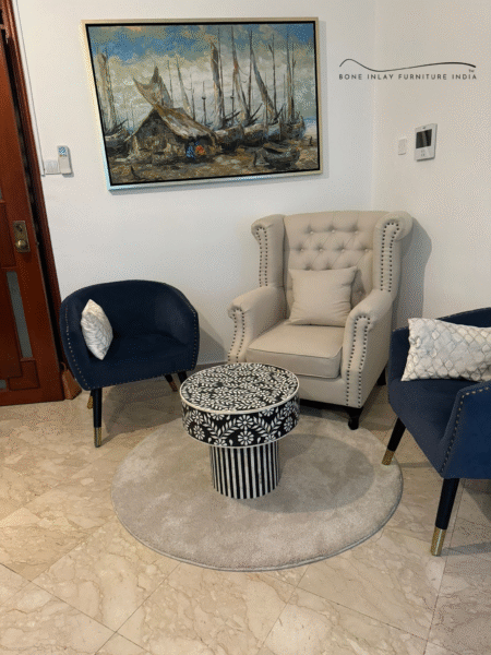 Available in a range of stylish color palettes – such as black & white, grey, blue, or ivory – the Bone Inlay Center Table seamlessly blends with both modern and traditional décor. Its flat, spacious surface is ideal for hosting coffee, decor items, or magazines, while the detailed craftsmanship makes it a work of art in its own right.