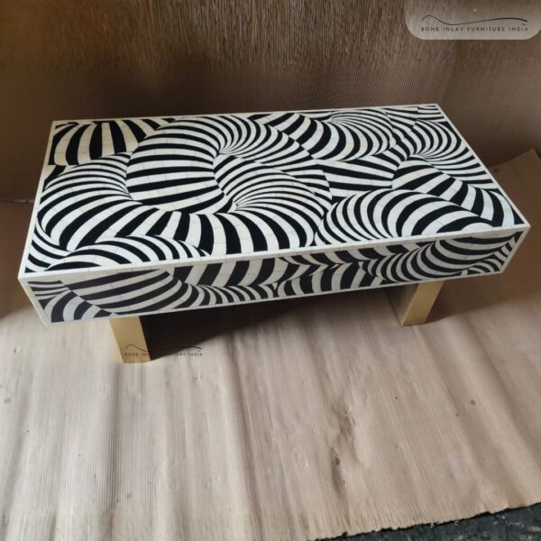 Bring home a masterpiece of craftsmanship and elegance with this stunning Bone Inlay Coiled Rectangular Coffee Table. Handcrafted using traditional techniques, every piece showcases the dedication and skill of artisans who meticulously place each bone tile into a mesmerizing coiled pattern. The striking contrast of Black & White enhances the intricate design, making it a captivating centerpiece for any living room.