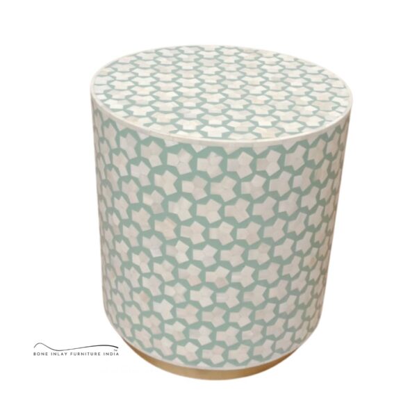 The structure is crafted from durable HDMR board, offering both strength and smooth finish, while the intricate inlay work turns the piece into a true statement of luxury. Its compact round shape (40 x 40 x 45 cm) is designed to fit effortlessly into any corner — be it beside your sofa, bed, or as a centerpiece in a cozy reading nook.