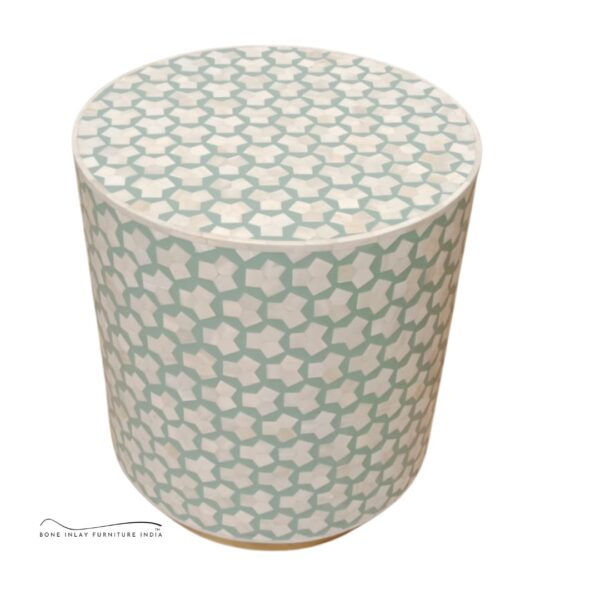 Add a splash of vibrant elegance to your space with our Bone Inlay Round Side Table, a perfect fusion of age-old craftsmanship and contemporary design. Painstakingly handcrafted by skilled artisans, this table features a mesmerizing geometric pattern inlay made from ethically sourced camel bone, delicately set against a radiant Turkish Blue resin background.