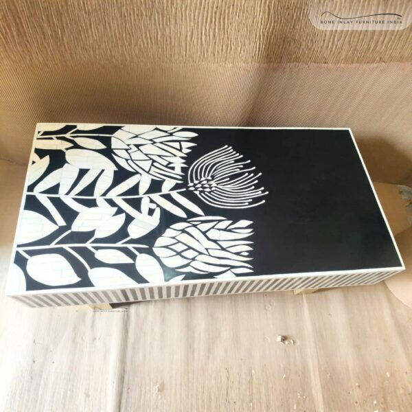 Introducing the Bone Inlay Tulip Center Table, a masterpiece that brings elegance, tradition, and modern functionality together in one stunning piece. Crafted by highly skilled artisans, this center table features a beautiful tulip-pattern inlay, hand-set using ethically sourced camel bone and premium resin. Each tulip motif is carved with precision and individually laid into the resin surface, showcasing the unmatched artistry of traditional craftsmanship.