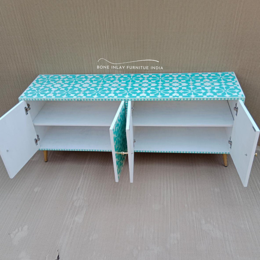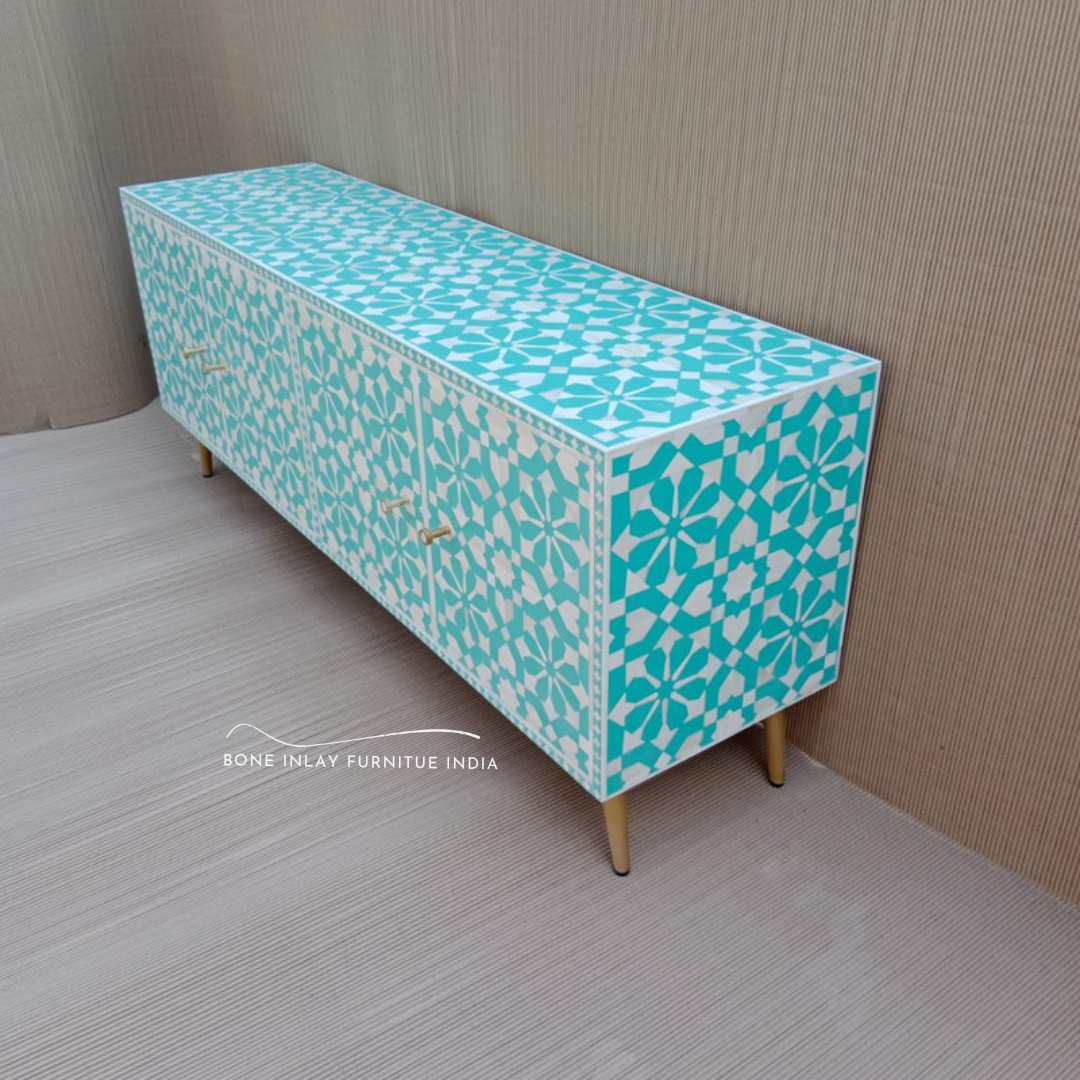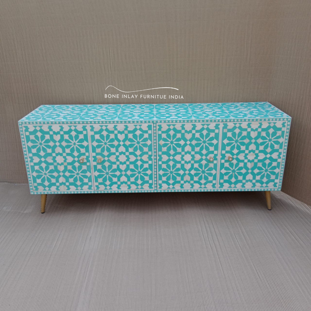 Geometric Bone Inlay TV Unit – Turkish Blue Finish